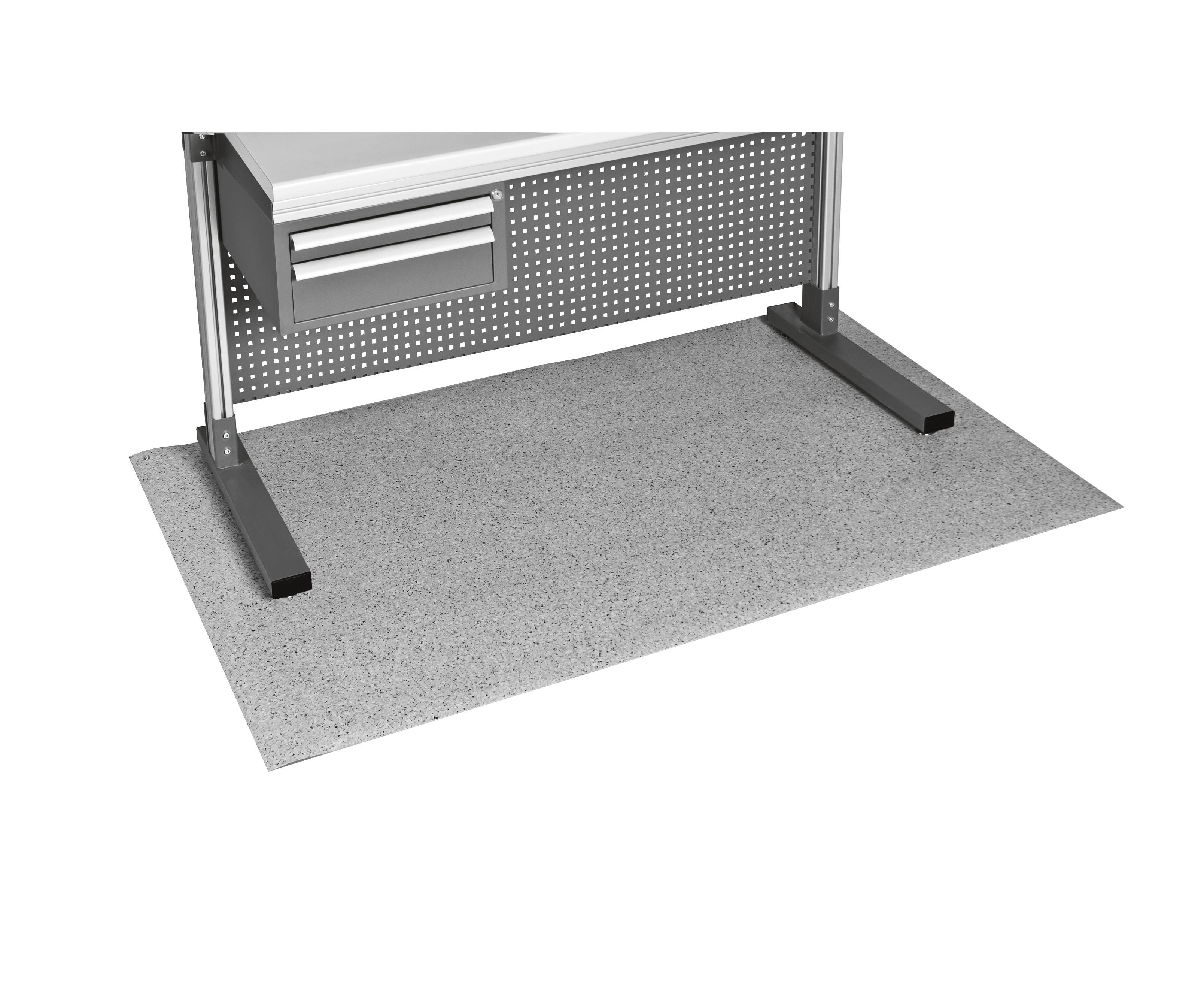 Двухслойный антистатический напольный коврик толщиной 2,5 мм, суперизносостойкий, шумопоглощающий, негорючий, термостойкий, верхний слой рассеивающий, нижний – проводящий: время стекания заряда от 1000 В до 50 В – менее 0,5 с, сопротивление относительно земли менее 100 М0м, комбинированное сопротивление менее 35 МOм.