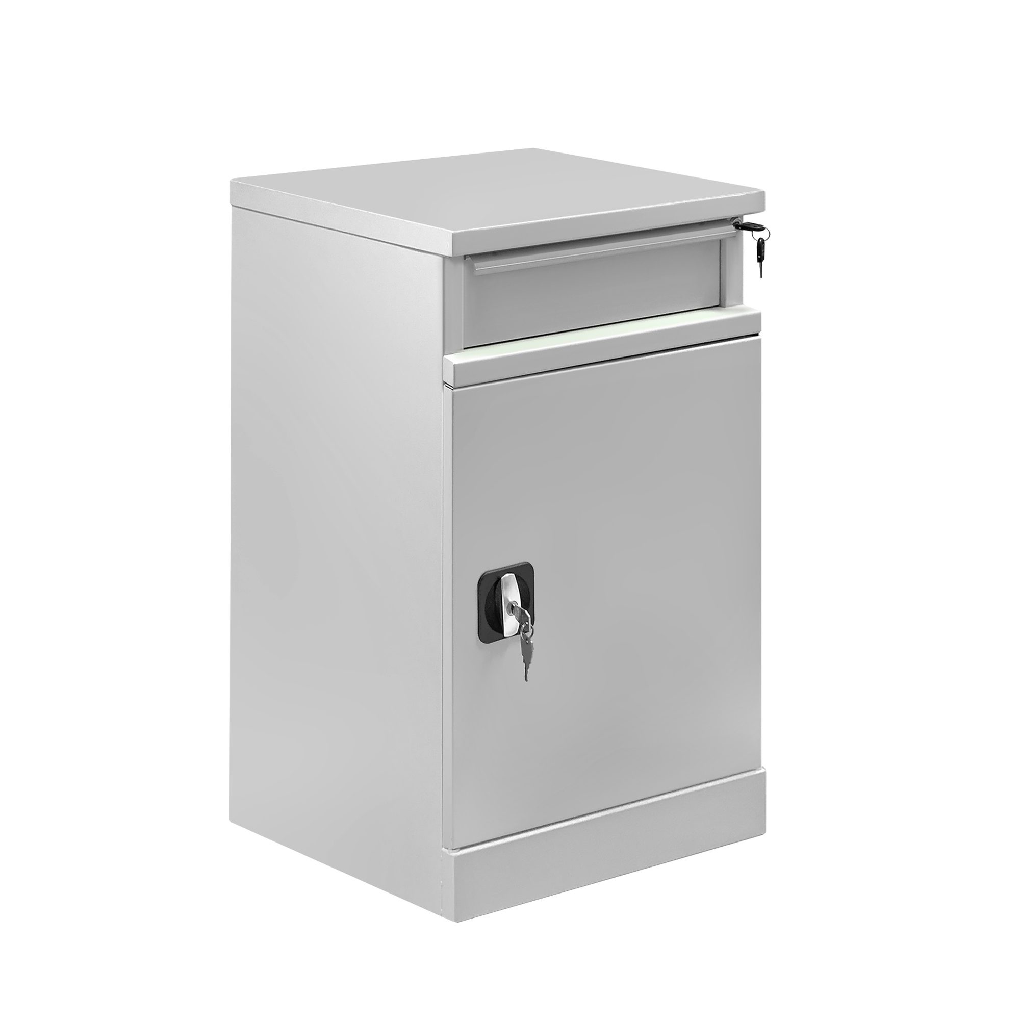 Металлическая тумба ТC-2 оборудована ригельным замком с ручкой и поставляется в комплекте с 2 ключами. Ящик тумбы имеет замок для индивидуального доступа. Корпус и полка изготовлены из листового металла для увеличения эксплуатационного ресурса и повышения надежности.